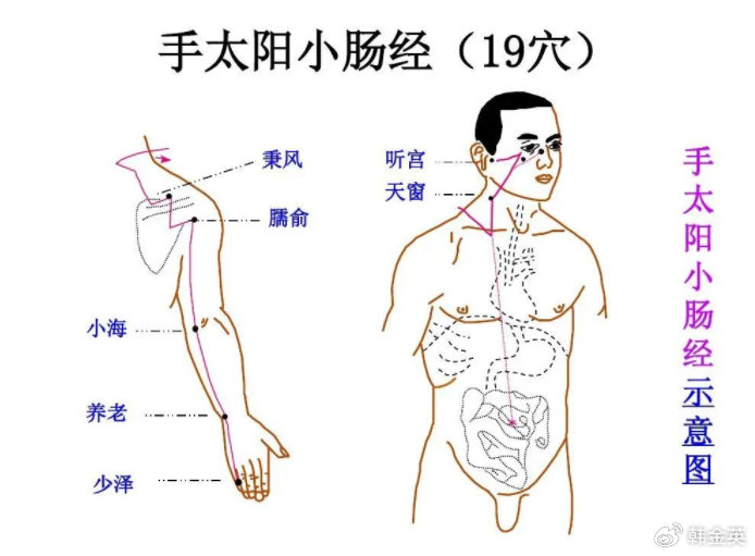 小肠经,《内经》说小肠:“受盛之官,化物出焉”。小肠是赤肠,胃之下口等。手太阳小肠经,它流注的时间为下午一点到三点。有的病人说,吃完中餐就很累,昏昏沉沉到三点多以后精神又来了,这就是小肠有问题。这个小肠有问题,不见得是病,而是小肠比较虚弱一点。当你按照时辰发病的时候,依《针灸甲乙经》,就是取俞穴。